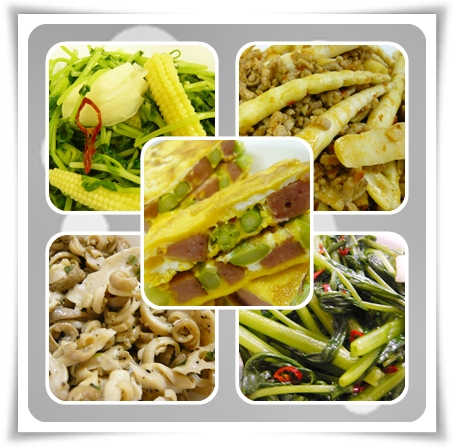 1.左上→綠豆芽炒玉筍(玉筍先用熱水燙過撈起,炒鍋放油加熱再放進玉筍/綠豆芽大火快炒..記得要調味嘿)