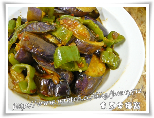 材料:茄子3條、青椒3個、豆瓣醬2大匙、糖1小匙、清水4大匙