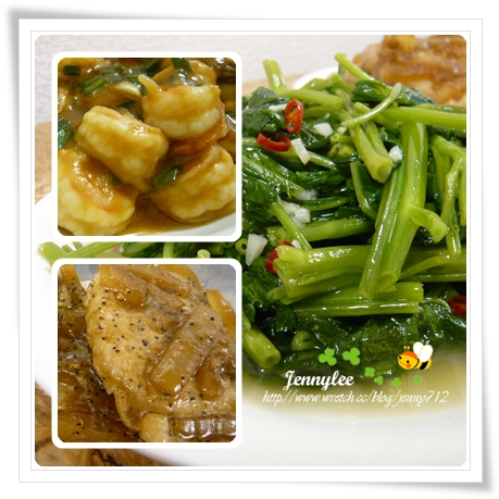 【圖:蔥燒蝦、黑胡椒豬排、辣炒空心菜】