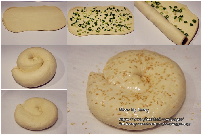 撒上蔥花捲起呈長條狀後盤成圓形再略桿扁些放入電鍋中(約3公分厚度),