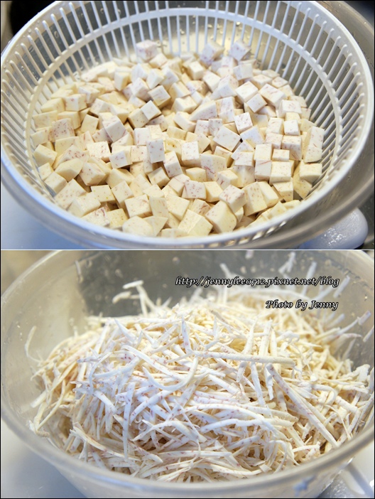 〈2〉芋頭洗淨去皮分成兩等份,一份切細丁(約1*1公分)、一份刨絲。